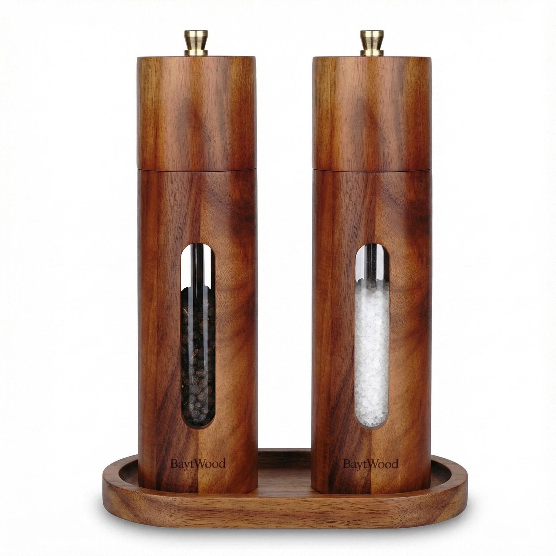 • Gold Accent Knobs: Refined metal tops add a premium touch and help distinguish salt from pepper.